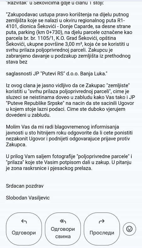 “Ono što u zemlji čuda više nije tragično, nego komično, jeste činjenica da iz njegovog odgovora vidim da mi posjedujemo dva Ugovora, “ista, ali različita”. U njegovom se ne spominje poljoprivredno dobro, a u mom je odmah tu, u članu 1, što otvara ogromnu sumnju u falsifikovanje ugovora. Nakon svega sam se obratio Slađani Jakšić, koja je prema mojim informacijama nadležna za putni pojas u JP “Putevi RS” i njen odgovor čekam i dalje. Ne mogu oni kriti kriminal koliko ja mogu čekati i dočekati”, upozorava Vasiljević.