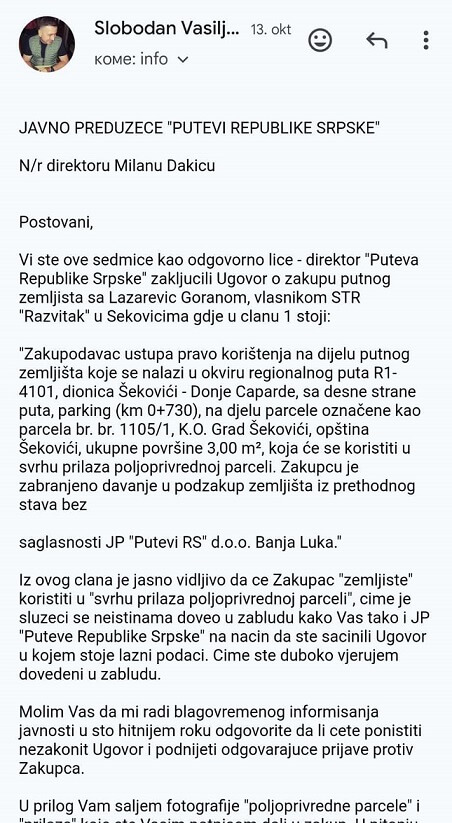 Vasiljević kaže i da se zvanično obratio JP “Putevi Republike Srpske” putem elektronske pošte.
