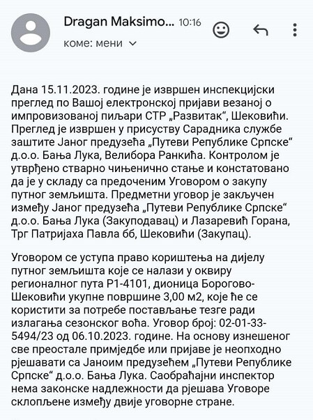 “Pješački prelaz svakodnevno koriste djeca iz naselja Sučani, prilikom odlaska u školu. Nakon utvrđivanja činjenica koje su potvrdile osnovanost mog zahtjeva, Komunalna policija donosi rješenje o uklanjanju improvizovane deponije i daje rok od osam dana vlasniku, što on i čini nakon isteka roka. Međutim, kroz nekoliko dana Goran Lazarević prilaže Ugovor o zakupu sklopljen sa JP “Putevi Srpske” koji je potpisao VD direktor Milan Dakić, po kojem mu oni izdaju tri kvadratna metra koja će isti koristiti kao “prilaz poljoprivrednom zemljistu””, ističe Vasiljević i dodaje da je nakon toga upoznao Dakića o navedenom i dobio garanciju da će nakon vanrednog inspekcijskog nadzora “Putevi” poništiti sporni ugovor.