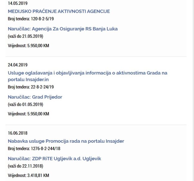 Ovdje vrijedi pomenuti i portal Insajder.in, koji je, kako Infoveza saznaje, u vlasništvu Dušana Rosića, člana gradskog odbora DNS-a iz Banjaluke. Jedini prihod koji ovaj portal formalno ima jeste prihod od javnih institucija i preduzeća. Tako su finansijeri Insajdera tokom prošle godine bili Grad Prijedor, Agencija za osiguranje Republike Srpske i RiTE Ugljevik. Rukovodioci sva tri finansijera Insajdera su u vrijeme potpisivanja ugovora bili istaknuti DNS-ovci: Milenko Đaković, Slaven Dujaković i Čedomir Stojanović. Ukupan prihod koji je Insajder imao tokom 2019. godine iznosi 17.650 KM, a čije su ovce, toga je i njiva, pa je „politički favorit“ Insajdera, praktično od trenutka nastanka ovog portala, Demokratski narodni savez.