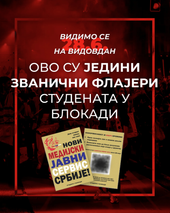 Na Vidovdan su studenti u blokadi ponovo reagovali na medijsku sliku u Srbiji. Delili su flajere sa natpisom „Dok starog nema, mi smo novi medijski javni servis Srbije!”. Na njemu se nalazi QR kod pomoću kog građani mogu da se prijave na mejling listu i tako dobijaju informacije o daljim studentskim aktivnostima.