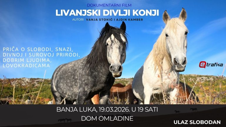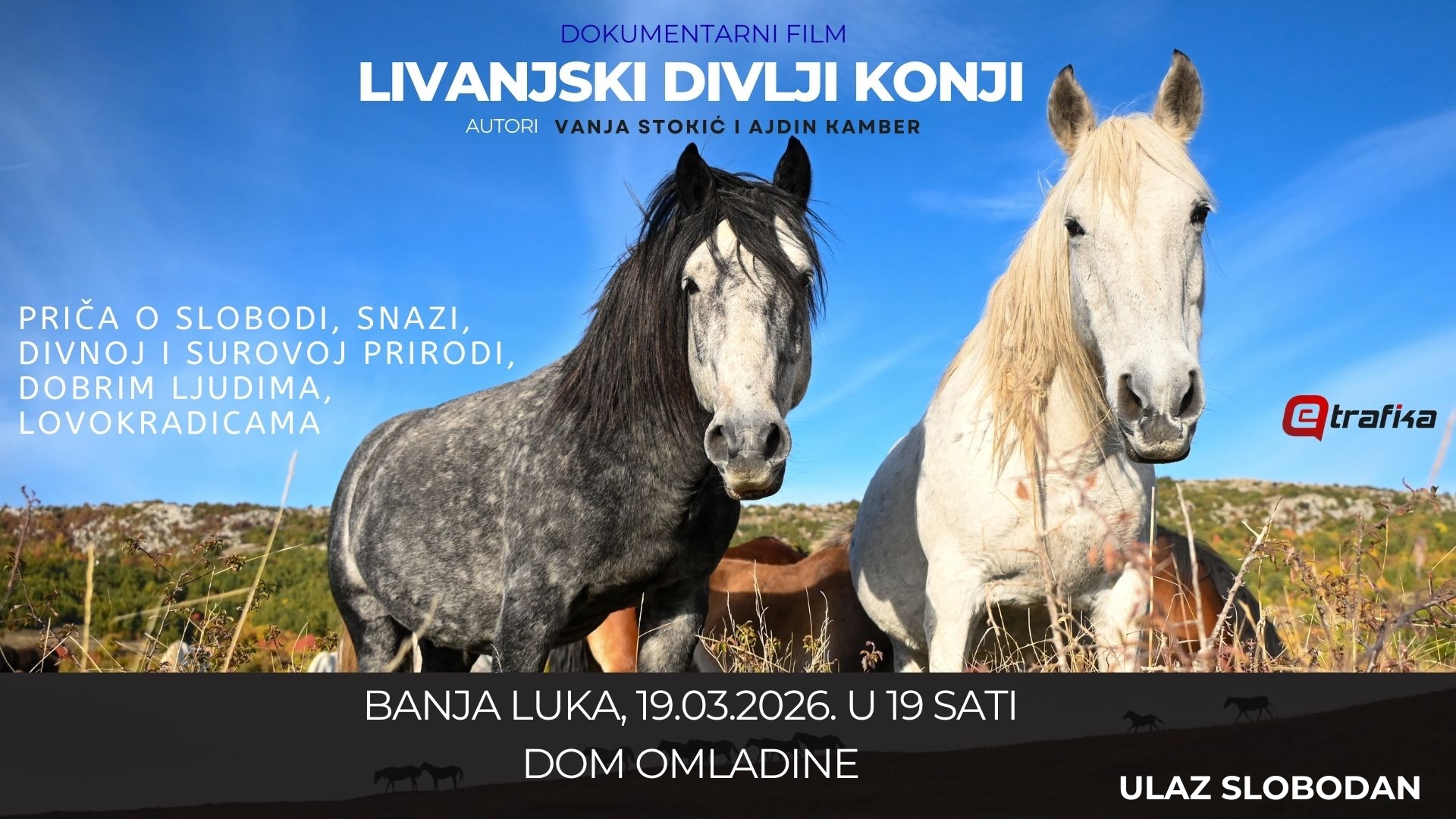 Dokumentarni film eTrafike „Livanjski divlji konji – između slobode i nebrige” biće prikazan u Domu omladine Banjaluka u četvrtak, 19. marta, u 19 sati. Nakon projekcije slijedi razgovor sa autorima Vanjom Stokić i Ajdinom Kamberom. Ulaz je slobodan!