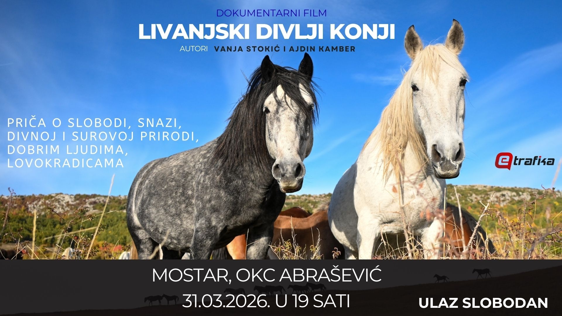 Dokumentarni film eTrafike „Livanjski divlji konji – između slobode i nebrige” biće prikazan u OKC Abrašević u Mostaru (ulica Alekse Šantića 25), u utorak, 31. marta, u 19 sati. Ulaz je slobodan, a nakon projekcije slijedi razgovor sa autorima Vanjom Stokić i Ajdinom Kamberom.
