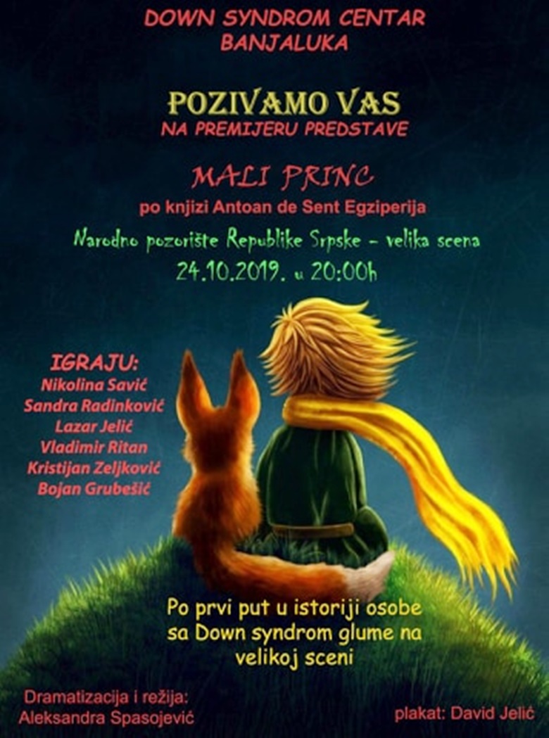 U Narodnom pozorištu Republike Srpske 24. oktobra od 20:00 časova će se održati premijera predstave “Mali princ” u izvođenju prve škole glume za osobe sa Daunovim sindromom.