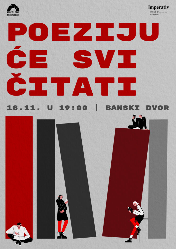 18. novembra u 19:00 časova, u Crvenom salonu Banskog dvora održaće se program “Poeziju će svi čitati”. Urednik ovog programa je publika koja ima priliku da izabere i pročita pjesme autora iz regiona. Ovaj program je prilika za mlade, neafirmisane autore da prvi put pred publikom pročitaju svoje pjesme. Predstaviće nam se i nekoliko mladih pjesnika koji su tokom 6. regionalnog festivala “Imperativ” učestvovali u radionici pisanja poezije pod mentorstvom pjesnika Zvonka Karanovića.