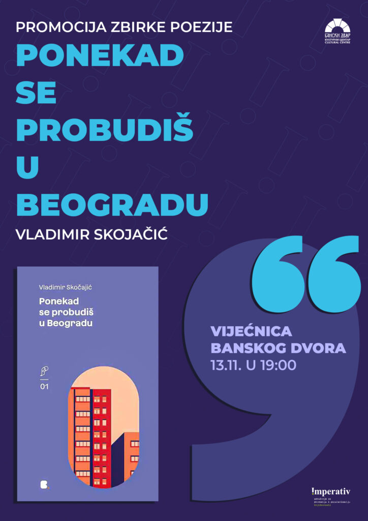 Skočajića održaće se 13. novembra u 19.00 časova u Vijećnici Banskog dvora. Sa Skočajićem će razgovarati novinar Saša Berendika, a poeziju će čitati članice Teatra poezije “IMPERATIV”.