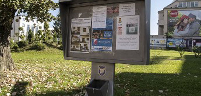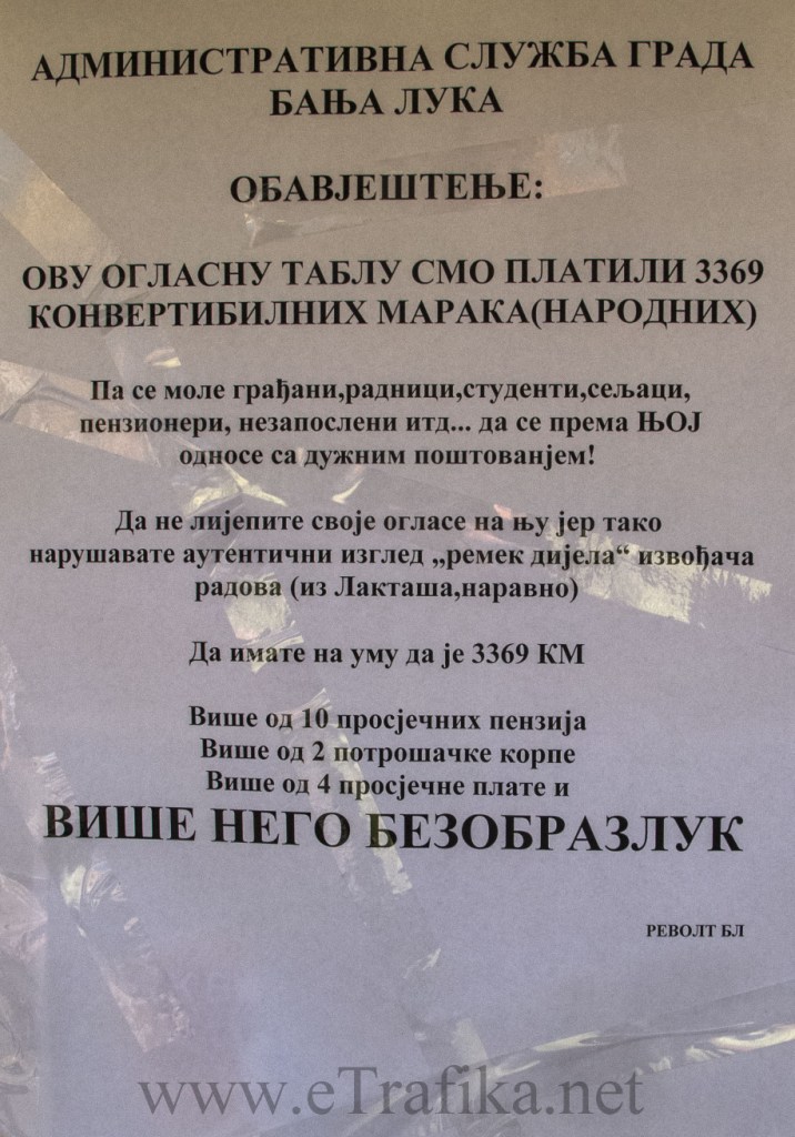 “Ovu oglasnu tablu smo platili 3.369 konvertibilnih maraka (narodnih), pa se mole građani, radnici, studenti, seljaci, penzioneri, nezaposleni, itd…da se prema njoj odnose sa dužnim poštovanjem! Da ne lijepite svoje oglase na nju jer tako narušavate autentični izgled ‘remek djela’ izvođača radova (iz Laktaša naravno). Da imate na umu da je 3.369 KM više od 10 prosječnih penzija, dvije potrošačke korpe, četiri prosječne plate I VIŠE NEGO BEZOBRAZLUK!”