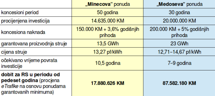 Između ostalog, ugovor o koncesiji sa „Minecom” sklopljen je na pedesetogodišnji period, dok je „Medos” nudio koncesioni period od trideset godina. Procijenjena vrijednost „Minecove” investicije za realizaciju projekta je 14.635.000 KM, a „Medos” je planirao uložiti 20.000.000 KM. „Minecova” koncesiona naknada iznosi 150.000 KM prije zaključivanja ugovora, plus 3,6% ukupnog godišnjeg prihoda. „Medos” je nudio 200.000 KM i 5 odsto. Po ugovoru sa „Minecom”, procijenjena godišnja proizvodnja struje iznosi 13,5 GWh. „Medos” je garantovao 23 GWh. Po „Minecovoj” ponudi, očekivani povrat investicije je deset i po godina, a po „Medosevoj” sedam do devet godina, saznaje eTrafika.