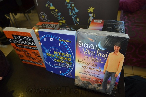 “Vidiš ovu knjigu ‘Sretan vam kraj svijeta kakvog ste poznavali’, (za stolom vidimo i tu i još nekoliko kniga) izdata je prije tri, četiri godine, a sada ću napraviti novu takvu. To je knjiga koja sabira 40 intervjua isključivo sa strancima koji su prvaci u svojim područjima, koje sam ja lično sreo. Nema tu imena koje sam ja sreo na konferencijama što su dolazili u Zagreb, što sam ih ja zvao iz drugog dijela svijeta, ili sam ih nekad intervjuisao preko interneta, preko satelita i slično. Znači, apsolutno sva imena na koja ćete naići u svim knjigama iz različitih područja znanja. Tome su pripomogle mnoge konferencije. Dođeš tamo, na jednom mjestu imaš deset ljudi svake godine. Ja se prije svega bavim graničnim područjima ljudskog znanja, znači govorim o tom području.”