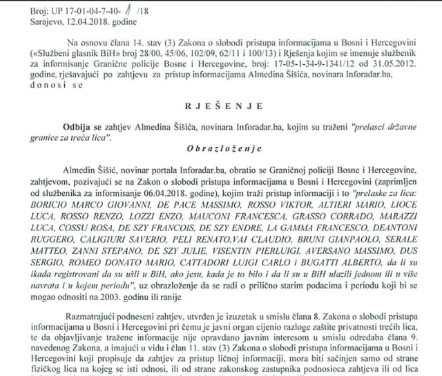„Takav zahtjev može da podnese samo fizičko lice na koje se zahtjev odnosi, ili njegov ovlašćeni zastupnik. Prema procjenama Agencije za zaštitu ličnih podataka BiH, takva vrsta informacija može biti proslijeđena samo policijskim ili pravosudnim organima“, odgovorili su iz Granične policije.
