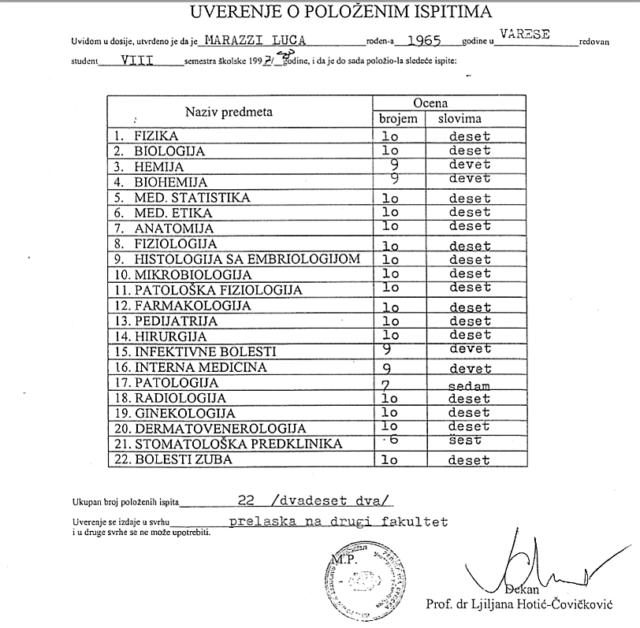 Osim činjenice da su neki od „studenata“ tada bili prilično vremešni, a pojedini bliže penziji nego cvijetu mladosti pa je, recimo, Rosa Cossu iz Sasarija, 1996. imala 36 godina, a njen kolega, Đan Paolo Bruni iz Firence čak 47, posebno su indikativna uvjerenja o položenim ispitima do kojih je Inforadar.ba takođe došao.