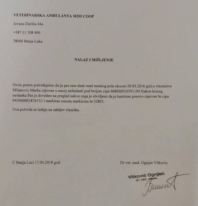 “Ne shvatam u kom smislu je ovo moja greška. Rekli su mi da sam ugradio mikročip u njega nakon što smo ga uhvatili, a ja imam papire od dana kada je čipovan. Išao sam i u Sarajevo da se sastanem sa predstavnicima Dogs Trusta, ostali su u šoku i nisu znali šta da mi kažu. Poslali su sve te papire u London i prije nekoliko dana sam dobio odgovor da će raskinuti ugovor sa ‘Šapicom’. Pokrenuću sudski spor protiv ove ambulante jer mi je načinjena šteta. Već sam se čuo sa jedinim sudskim vještakom za životinje u BiH, a naredni korak je da nađem odgovarajućeg advokata”, govori nam Milanović.