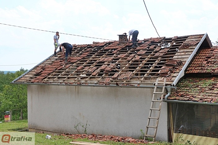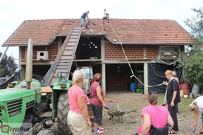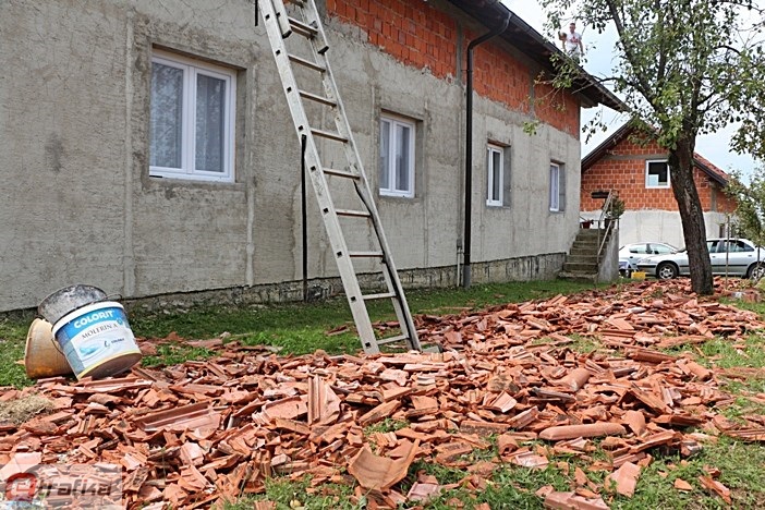 Porodicu Brane i Milke Šukalo zatekli smo na krovu pomoćnog objekta u Prijakovcima, kako pokušavaju popuniti nastale pukotine i zaštititi ono malo dobara koje im nije uništeno u jučerašnjem nevremenu.