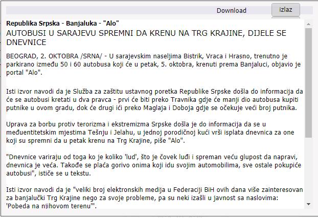 Naime, agencija Srna prenijela je juče tekst iz srbijanskog tabloida Alo, pod naslovom “Autobusi u Sarajevu spremni da krenu na Trg Krajine, dijele se dnevnice”. U tekstu se bez ijednog dokaza tvrdi da je u sarajevskim naseljima Bistrik, Vraca i Hrasno parkirano između 50 i 60 autobusa, koji su spremni da 05. oktobra krenu prema Banjaluci. Pozivajući se na Upravu za borbu protiv terorizma i ekstremizma RS, navodi se da se u Jelahu i Tešnju isplaćuju dnevnike onima koji su spremni da u petak otputuju u Banjaluku. Kako kažu, dnevnica zavisi od toga “koliko je ko lud”.