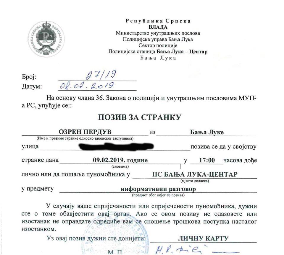 Na pitanje kako su napravili izbor koga od novinara da legitimišu, jer ih je večeras bilo više, uslijedio je odgovor da im je “interesantno što je aktivna”. Nakon bilježenja podataka, policajci su se povukli, da bi se odmah vratili da isto ponove sa još dvije djevojke, ali i novinarom Dnevnog Avaza Goranom Dakićem koji je bio u blizini.