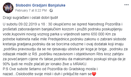 Ova šetnja najavljena je na Facebook stranici pod nazivom “Slobodni građani Banjaluke”, a kao razlog navedena je “podrška poskupljenju vode, kupovini novog voznog parka, odlazak mladih iz RS…”