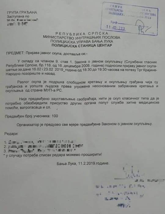 Grupa građana Banjaluke predala je danas MUP-u RS zahtjev za odobravanje dva skupa – 16. i 23. februara od 18:30 do 19:30, na potezu Trg Krajine – Narodno pozorište RS – Trg Krajine.