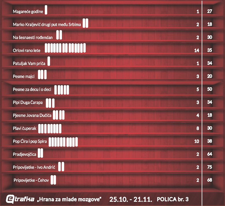 Trenutno je potrebno najviše primjeraka knjige „Družba Pere Kvržice“ (104), te „Rođendana u šumi“ (94). S druge strane, potrebno je prikupiti još samo 4 primjerka knjige „Radoznali dječak“ da bi se popunila polica!