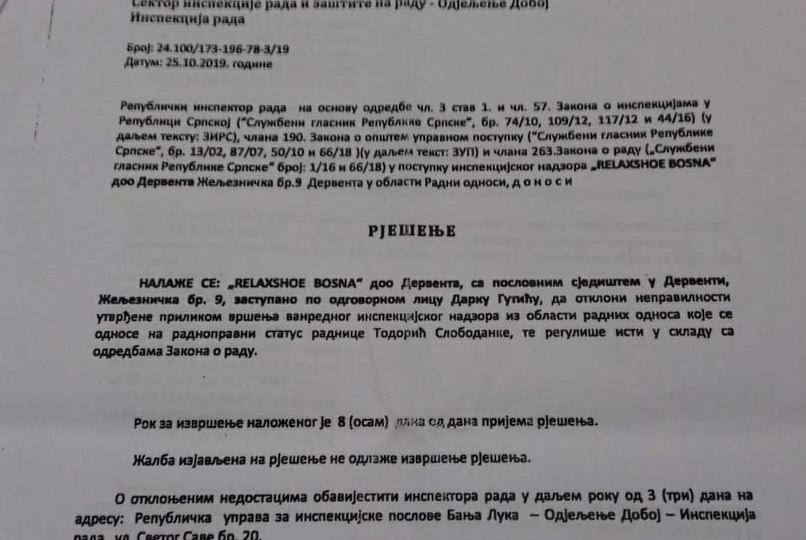 „Relaxshoe Bosna“ je uložio žalbu Ministarstvu rada i boračko-invalidske zaštite RS, ali je u drugostepenom postupku odbijena kao neosnovana. Podnijeli su žalbu i sudu, navodeći da bi vraćanje radnice na posao bilo opterećenje za javne fondove i protiv javnog interesa RS!