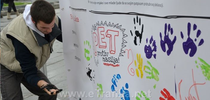 Radi se o potpisivanju deklaracije protiv svih vidova nasilja, što prolaznici čine otiskom svog dlana.