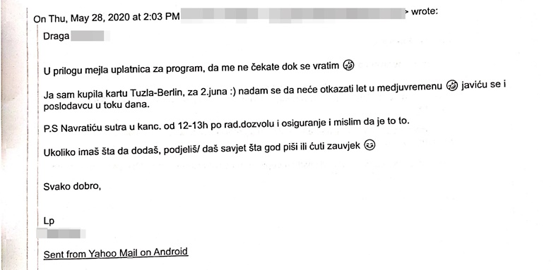 Nakon objave teksta, sagovornica je redakciji portala saopštila da je pristala da iduće godine ode na Work&Travel program u Njemačku. Naime, prihvatila je ponudu agencije Experience za rad u Minhenu. Ističe i da su joj iz agencije rekli da će povrat razlike u novcu izvršiti u januaru 2021. godine. Datumi polaska još uvijek nisu poznati, a za sve ovo još uvijek, osim dogovora putem mejla, koji je takođe u posjedu eTrafike, ne posjeduje nikakav dokument. Podsjećamo, naša sagovornica još od juna mjeseca pokušava riješiti ovaj problem.