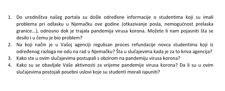 Takođe, nije nam jasno o kojim desetinama potencijalnih slučajeva agencija govori kada u svom demantiju jasno kaže da samo dva studenta nisu uspjela otići na program u Njemačku.