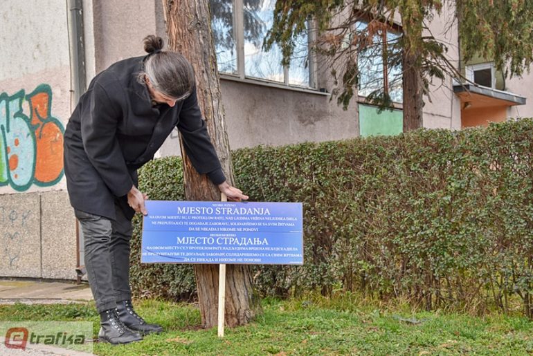 „Na ovom mjestu su, u proteklom ratu, nad ljudima vršena neljudska djela. Ne prepuštajući te događaje zaboravu, solidarišemo se sa svim žrtvama. Da se nikada i nikome ne ponovi“, piše na postavljenoj tabli.