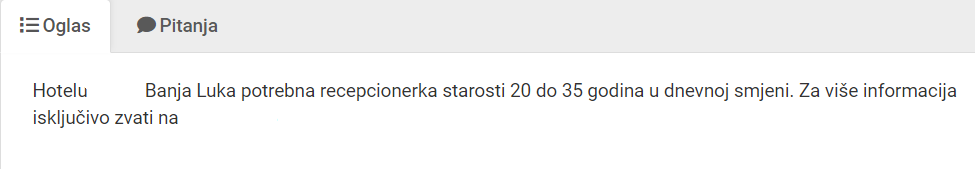 „Maksimalno do 40 (godina) je OK. Djevojke koje rade tu su poprilično mlađe. I djevojke koje rade u kafiću. Da kažem 20, 25. Tako primamo. Eto sad imamo jednu samo ženu koja ima 40 i to nam je najstarija osoba koja radi. Jednostvno takav krug ljudi, gostiju i tako. Ne znam šta da vam kažem, jednostavno takvo nam je neko pravilo. Nema nekog specijalnog razloga, ali tako primamo mlađe osobe“, kazala nam je ženska osoba, zaposlena u hotelu u Banjaluci, koji putem javnog oglasa traži recepcionerku starosti od 20 do 35 godina.