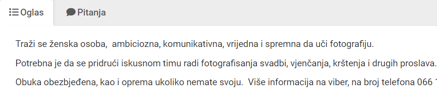 Potrebne radnice za prodaju lubenice, od 17 do 45 godina. Potrebna mlađa djevojka za rad u mirnom kafiću. Potrebna recepcionerka u hotelu starosti od 20 do 35 godina. Potrebna ženska osoba za posao fotografa.