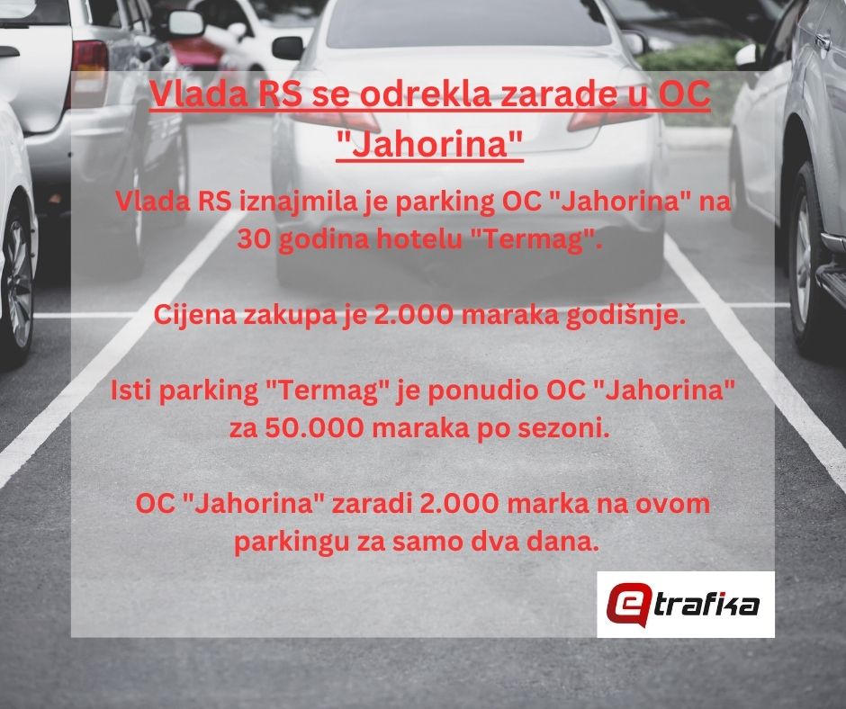 Vlada Republike Srpske iznajmila je parking javnog preduzeća Olimpijski centar “Jahorina” hotelu “Termag”, koji je u privatnom vlasništu, na 30 godina po cijeni od 2.000 maraka godišnje, a onda je taj isti hotel ovo parkiralište ponudio “Jahorini” za 50.000 maraka po sezoni.