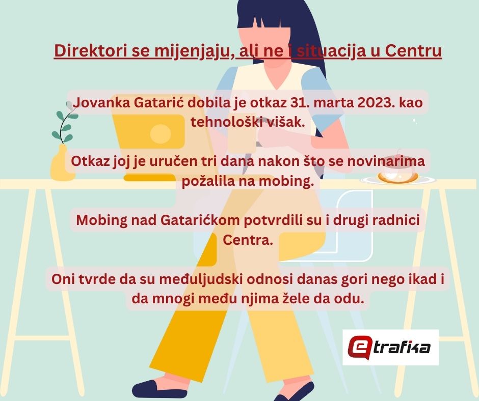 Namjerno ili slučajno, Jovanki Gatarić je otkaz uručen samo tri dana nakon što su novinari eTrafike pozvali telefonom direktora Želimira Radinovića zbog izjave o ovom slučaju. Iako je u prvi mah bio ljubazan, naša pitanja ga nisu oduševila. Sugerišući da se “bavimo glupostima” umjesto da pišemo o uspjesima Centra, na kraju je tražio pitanja, ali i broj urednice portala da, kako je rekao, “sa njom popriča”.