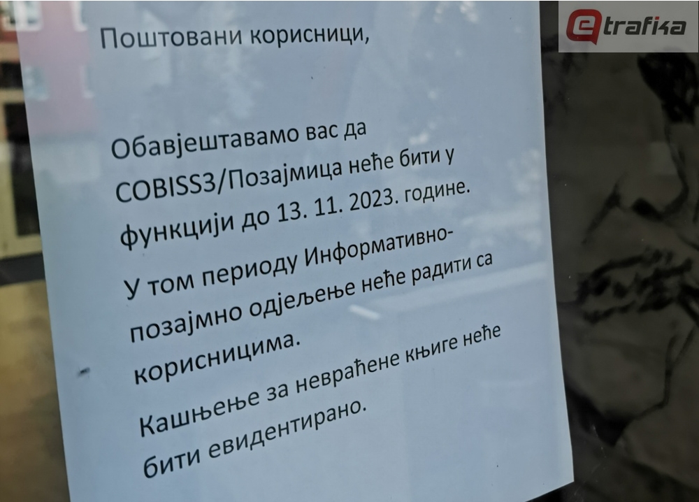 “Poštovani korisnici, obavještavamo vas da COBISS3/Pozajmica neće biti u funkciji do 13. 11. 2023. godine. U tom periodu Informativno-pozajmno odjeljenje neće raditi sa korisnicima.” Ovo obavještenje već nekoliko dana stoji na vratima Narodne i univerzitetske biblioteke Republike Srpske. Razlog je ponovo isti: Ministarstvo prosvjete i kulture Srpske nije platilo COBISS (elektronski bibliotečko-informacioni sistem sa uzajamnom katalogizacijom).