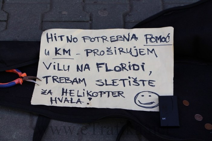 Prolaznike zabavlja svirajući domaći i strani rok. Kaže da radi za novac, ali su mu drage reakcije ljudi, pa mu mnogo znače osmijesi na smiješne poruke koje stavlja ispred sebe.