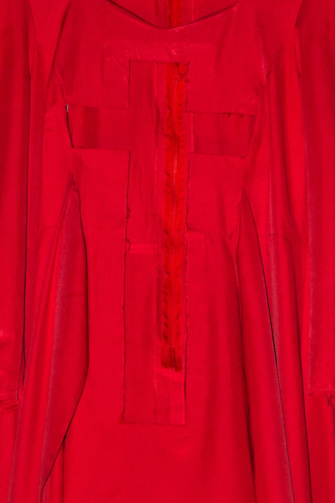“Ideja ovog rada najbliža je simboličkom spajanju dihotomije žena-kao-seksualni-objekt i žena-kao-savršena-domaćica-supruga-majka, dva dominantna konstrukta unutar registra ženske rodne uloge, čija je funkcija održavanje lagodnog života muškog dijela populacije, a koji su nastali ili se hrane unutar konstrukta religije kao takve. Stavljam fokus na hrišćanstvo jer krećem iz ličnog, s obzirom na iskustvo odrastanja u pravoslavnoj porodici gdje se gradila ambivalentnost unutar mog identiteta na granici između ova dva pola ženske rodne uloge, od kojih se za jedan ‘moram odlučiti’. Vršim intervenciju u kroju haljine, koji odgovara tradicionalnom hrišćanskom kodeksu oblačenja za žene: duga haljina dugih rukava i bez dekoltea. Oslobađam je tkanine u području reproduktivnih organa materijalizovanjem negativa forme krsta, a rezultat je univerzalna uniforma ‘prostitutke’ i ‘poštene žene potčinjene porodici”, navodi ona.