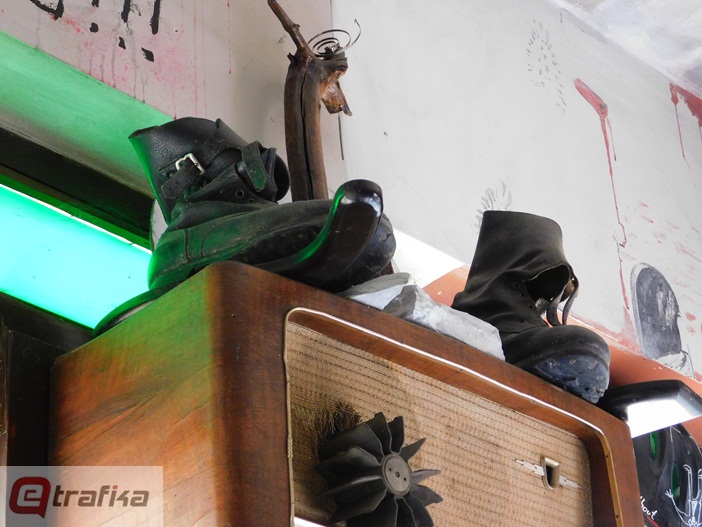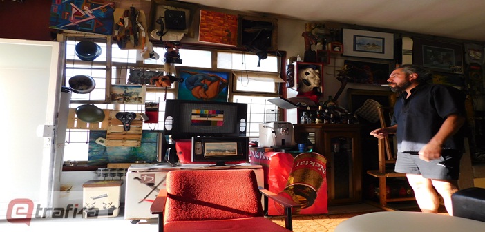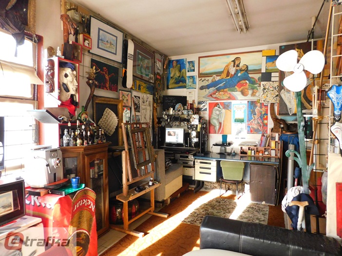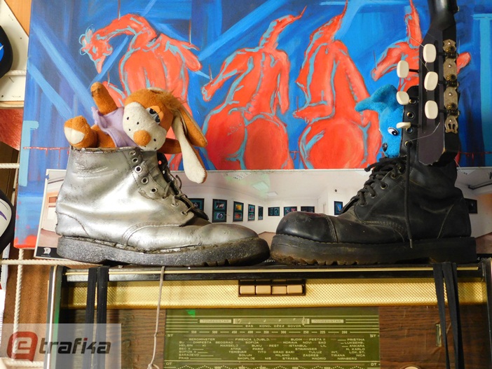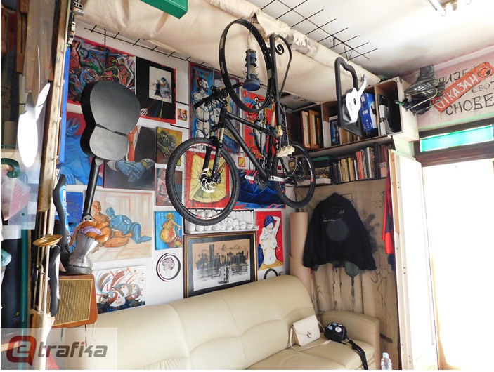 Iznad glave visi bicikl, tastatura je skoro na plafonu, a vojničke čizme pričaju priče iz vojničkih dana. Svaki zid je popunjen, a uskoro će biti i plafon, jer ne voli prazne zidove.
