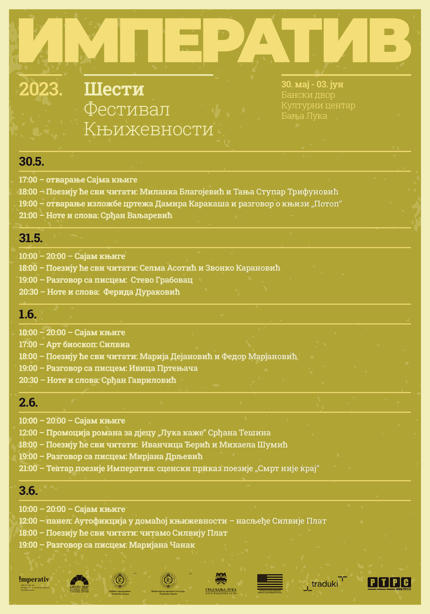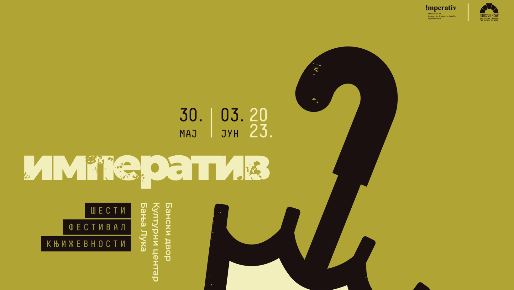Udruženje za promociju i popularizaciju književnosti „Imperativ“ organizuje 6. regionalni književni festival “Imperativ” od 30.5. do 3.6. u Banskom dvoru – Kulturni centar Banja Luka. Festival će okupiti više od 40 značajnih pisaca, izdavači, kritičari, prevodioci i novinari iz regiona. Osnovni cilj festivala je povezivanje pisaca, izdavača i književnih kritičara iz regiona, razmjena mišljenja i uspostavljanje saradnje. Poseban značaj festivala “Imperativ” je razvoj publike, uključivanje velikog broja mladih u programske sadržaje i predstavljanje knjiga koje privukle su veliku pažnju književne publike i kritike u protekloj godini.
