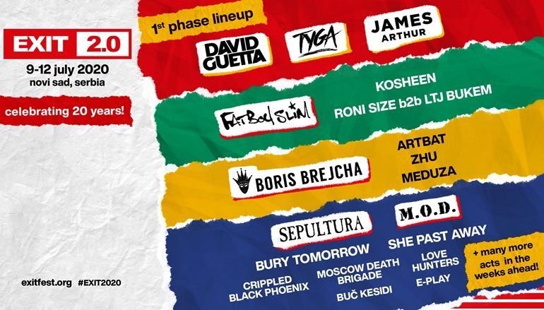 Muzičke superzvijezde, istinske legende i vodeći izvođači današnjice predvode prvih 20 imena objavljenih za veliku proslavu 20 godina EXIT festivala! David Guetta, Tyga, James Arthur, Fatboy Slim, Boris Brejcha, Sepultura, Artbat, Zhu, Meduza i mnogi drugi na Petrovaradinsku tvrđavu donose raznovrsne stilove elektronske, gitarske i hip-hop muzike, dok njihovi planetarni hitovi zajedno broje više od 20 milijardi YouTube pregleda!